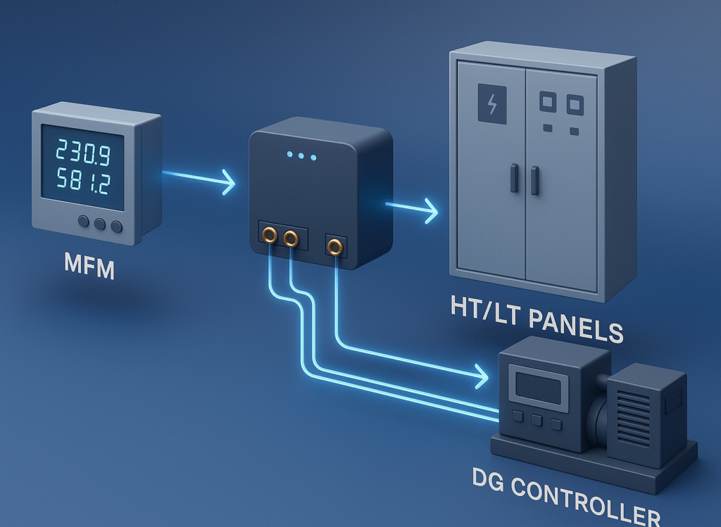 - Integrates with existing MFMs, HT/LT panels, DG controllers, retrofit friendly.