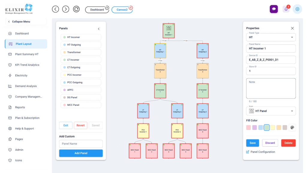 - Shows live status of HT, LT, MCC, DG, utilities, etc.